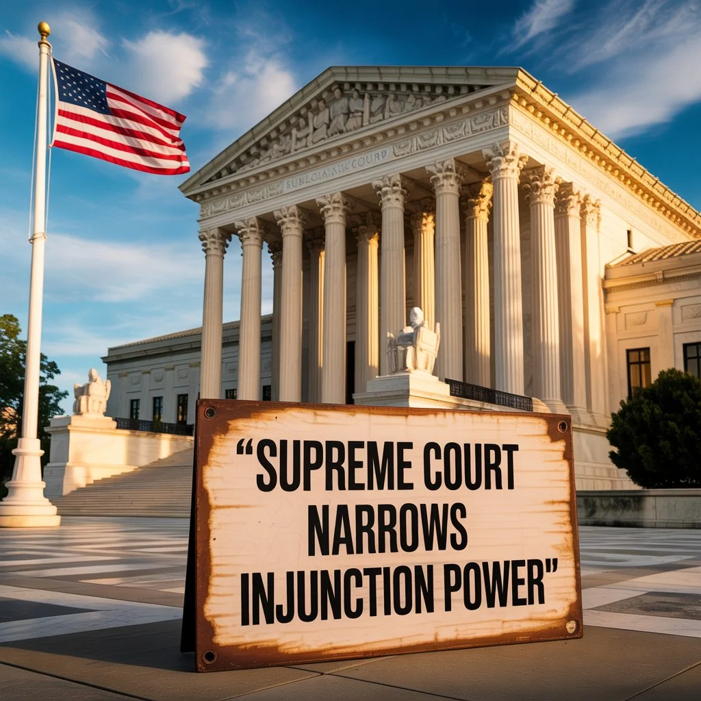 Supreme Court building with a sign on it which says Supreme Court Narrows Injunction Power.